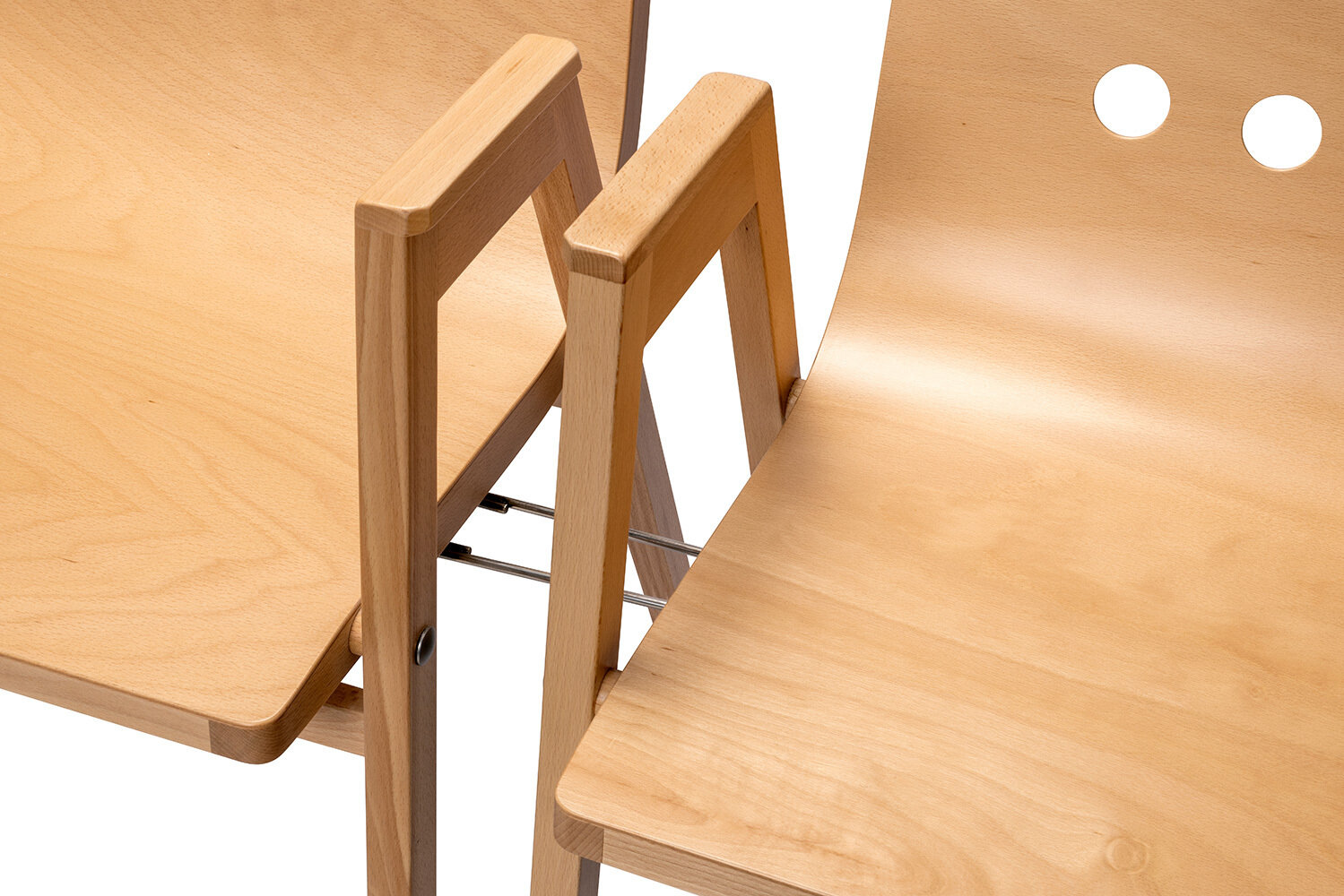 Durch die spezielle Konstruktionsweise wirkt der Stadthallensessel optisch massiv, robust und strahlt Wertigkeit aus. Gefertigt aus massivem Bugholz und durch eine «fremde Feder» aus nicht gebogenem Holz kombiniert, wird eine hohe Stabilität und Langlebigkeit erreicht. Dennoch überrascht das Stuhlprogramm durch verhältnismässig geringes Gewicht, was das Handling vereinfacht und ihn ideal macht für den Einsatz in Versammlungs- und Veranstaltungsräumen. Die Ausführungsmöglichkeiten sind vielseitig; Beizung von Gestell und Massivholzteilen oder Sperrholzschale Vorder- und/oder Rückseite, mit oder ohne Lochmuster, mit oder ohne Armlehnen. So lässt sich der Stapelsessel individuell und projektbezogen anpassen.