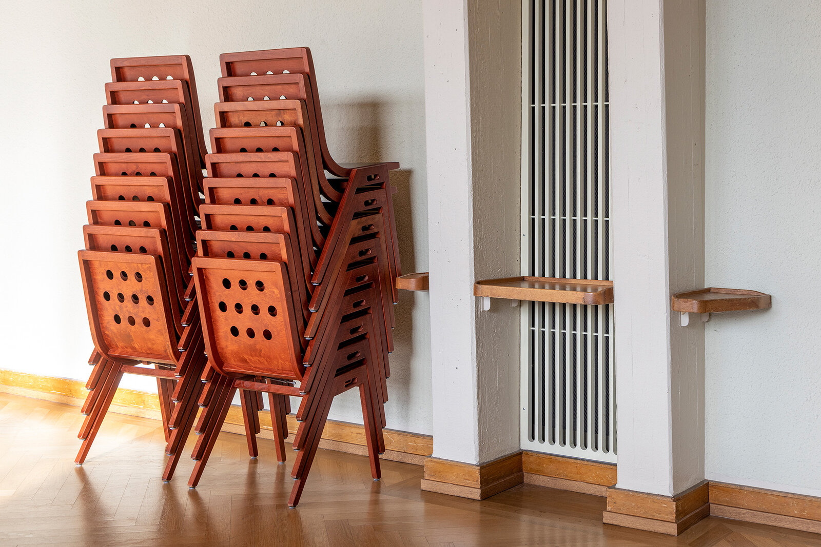 Durch die spezielle Konstruktionsweise wirkt der Stadthallensessel optisch massiv, robust und strahlt Wertigkeit aus. Gefertigt aus massivem Bugholz und durch eine «fremde Feder» aus nicht gebogenem Holz kombiniert, wird eine hohe Stabilität und Langlebigkeit erreicht. Dennoch überrascht das Stuhlprogramm durch verhältnismässig geringes Gewicht, was das Handling vereinfacht und ihn ideal macht für den Einsatz in Versammlungs- und Veranstaltungsräumen. Die Ausführungsmöglichkeiten sind vielseitig; Beizung von Gestell und Massivholzteilen oder Sperrholzschale Vorder- und/oder Rückseite, mit oder ohne Lochmuster, mit oder ohne Armlehnen. So lässt sich der Stapelsessel individuell und projektbezogen anpassen.