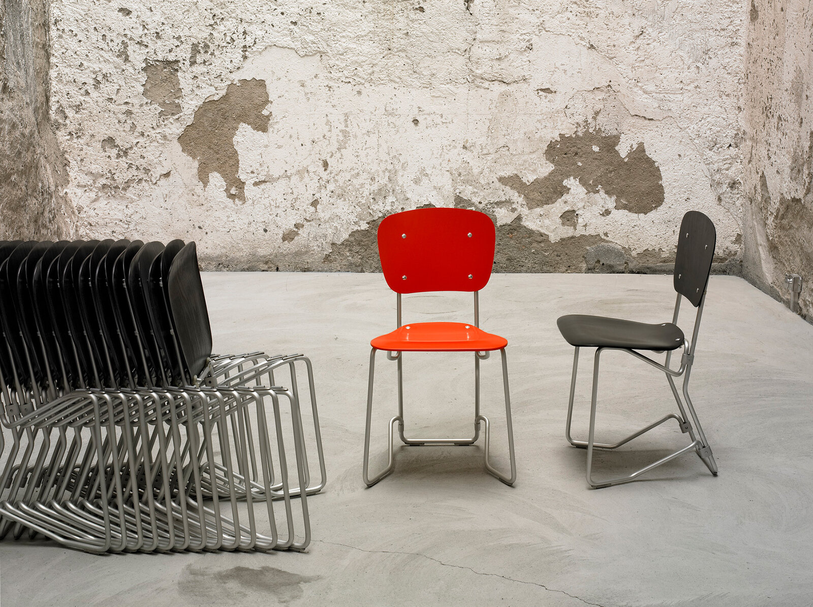 Der Stuhl überrascht durch seine äusserst ökonomische, horizontale Stapelfähigkeit (Schachtelung), durch sein Leichtgewicht von nur 3 kg, durch seine Robustheit und den hohen Sitzkomfort. Die Konstruktion von Armin Wirth basiert auf zwei gebogenen, mechanisch verbundenen Bügeln. Als Material wird massives korrosionsbeständiges Rundprofil aus einer Aluminiumlegierung verwendet. Die Oberfläche ist naturbelassen, anodisch oxydiert. Sitz und Rückenlehne sind aus 5-fach verleimtem Sperrholz in hell oder schwarz lackierter Buche gefertigt. Die flexible Rückenlehne (Flugzeugsperrholz) schmiegt sich jeder Körperhaltung an.
